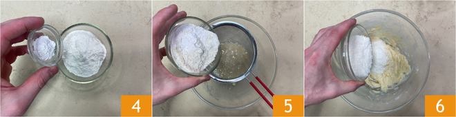 Misture a farinha e o fermento 4, então incorpore os secos à mistura peneirando-os com uma peneira 5. Junte o coco ralado 6.