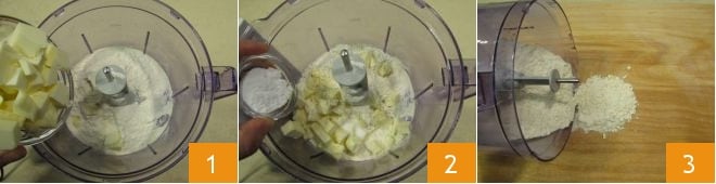 Para preparar os biscoitos de páprica, comece colocando a farinha e a manteiga fria cortada em pedaços em um mixer 1. Tempere com sal e pimenta, adicione o fermento 2 e ligue as lâminas para obter uma farofa. Transfira a mistura arenosa para a bancada 3,