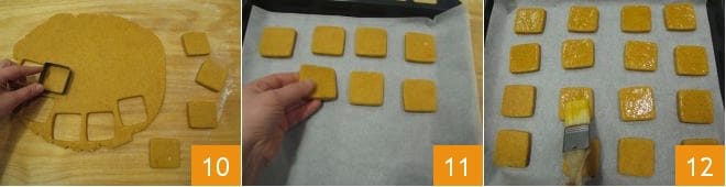 Com um cortador de massa quadrado de 5x5cm, faça os primeiros biscoitos 10: aos poucos, disponha-os na assadeira forrada com papel manteiga 11. Antes de passar para a cocção, recolha as sobras, amasse novamente e coloque para descansar, como antes, na geladeira. Enquanto isso, decore os biscoitos pincelando-os com um pouco de ovo 12.