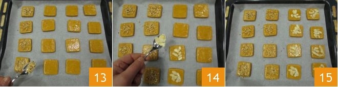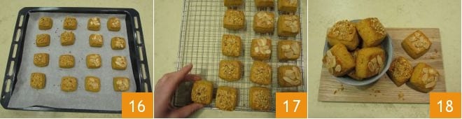 Depois polvilhe com a granola de avelãs 13 e as amêndoas em lâminas 14 e asse a primeira série de biscoitos em forno pré-aquecido, em modo estático, a 200° por cerca de 20 minutos 15.