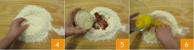 faça uma cova no centro 4 e adicione a páprica, o parmesão ralado 5, misture um pouco e depois adicione os ovos enquanto mistura com a mão 6.