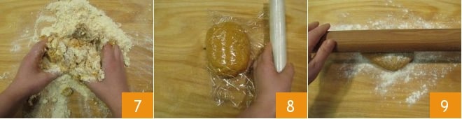 Agora comece a amassar até obter uma massa lisa e homogênea 7. Cubra com filme plástico e deixe descansar na geladeira por pelo menos meia hora 8. Após o tempo, pegue a massa e abra sobre uma superfície levemente enfarinhada, utilizando o rolo, até obter uma folha de meio centímetro de espessura 9.