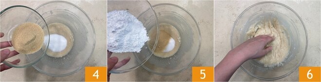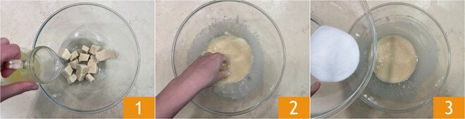 Para preparar os biscoitos de amêndoa e limão, a primeira coisa a fazer é cortar o marzipã em cubos e colocá-lo em uma tigela. Adicione aos poucos o suco de limão 1 e mexa com as mãos até que se dissolva 2. Em seguida, adicione o açúcar 3.