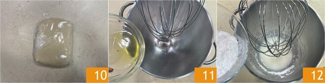 Achatá-lo ligeiramente 10 e coloque na geladeira por cerca de 30 minutos. Enquanto isso, prepare a cobertura. Comece a bater as claras 11 e quando estiverem espumosas, adicione o açúcar de confeiteiro em várias etapas 12.