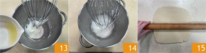 Continue batendo a mistura por cerca de 10 minutos e no final adicione o suco de meio limão 13. Misture por mais alguns instantes 14 e reserve. Retire a massa de amêndoas e abra-a sobre uma superfície levemente enfarinhada com a farinha de amêndoas, usando um rolo até obter uma espessura de meio cm 15.