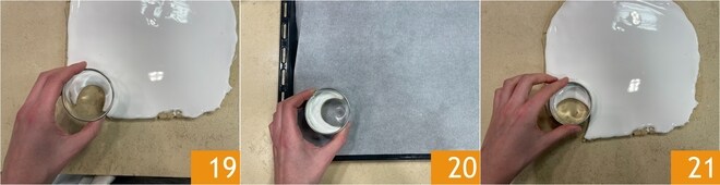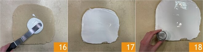 Adicione um pouco de cobertura por cima 16 e espalhe até obter uma espessura de 2 mm 17. Agora forme os biscoitos. Com um cortador de 6 cm, retire um círculo de massa para criar a forma interna da meia-lua 18.