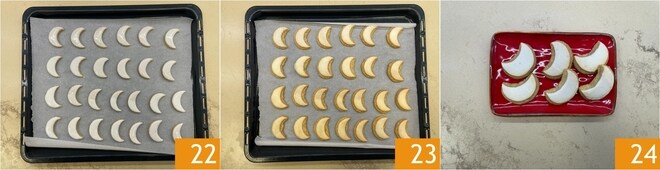 Agora forme a primeira lua, sempre usando o cortador 19 e transfira-a para uma assadeira forrada com papel manteiga 20. Continue formando as outras luas sempre com o cortador 21. Cada vez que reutilizar o cortador, molhe-o com um pouco de água, que você terá em uma tigelinha ao lado.