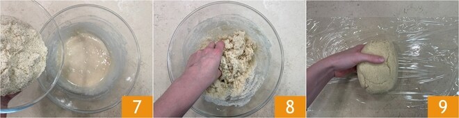 Adicione também a farinha de amêndoas 7 e amasse com as mãos até obter uma massa homogênea 8. Forme um bloco e envolva-o em filme plástico 9.