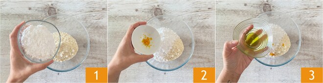 Para preparar os biscoitos de amêndoa, coloque numa tigela a farinha de amêndoas, o açúcar de confeiteiro 1, a casca de laranja ralada 2 e as claras de ovo 3.