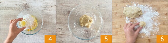 Adocique com o mel millefiori 4. Misture com uma colher e, quando os ingredientes estiverem bem incorporados, comece a sovar com a ponta dos dedos 5. Transfira a massa para uma superfície de trabalho enfarinhada com açúcar de confeiteiro 6 e separe pedaços de massa de 30 g cada e forme bolinhas.