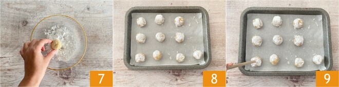 Passe os biscoitos de amêndoa no açúcar de confeiteiro 7 e, aos poucos, coloque-os em uma assadeira forrada com papel manteiga 8. Você pode dar a forma de rosquinhas de amêndoa fazendo um furo no centro com o cabo de uma colher de pau 9.