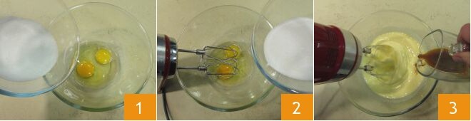 Para preparar os biscoitos de café, coloque em uma tigela grande os ovos inteiros e o açúcar, bata com a batedeira 2 até obter uma mistura clara e homogênea. Neste ponto, adicione o café líquido preparado com a cafeteira em temperatura ambiente 3 e continue a bater com a batedeira.