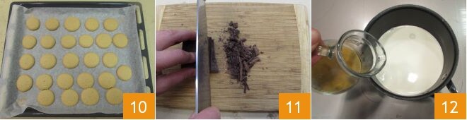 Asse os biscoitos em forno estático pré-aquecido a 180°C por 10 minutos. Asse uma assadeira de cada vez, mantendo a massa em temperatura ambiente. Após o cozimento, retire os biscoitos do forno e deixe-os esfriar 10. Enquanto isso, prepare o creme: pique o chocolate meio amargo 11 e derreta-o em banho-maria ou no micro-ondas. Em uma panela, aqueça o creme de leite e o café feito com a cafeteira 12.