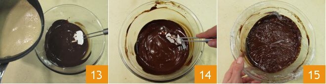 Quando a mistura atingir o ponto de fervura, retire do fogo e despeje sobre o chocolate derretido em três partes, misturando com uma espátula 13. Você deve obter um creme de consistência bastante densa 14. Cubra com filme plástico e leve para firmar na geladeira por 30 minutos.