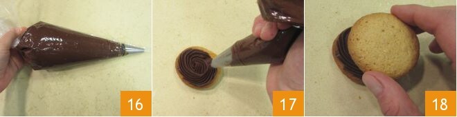 Depois desse tempo, coloque o creme em um saco de confeitar com bico estrela de 6 mm de diâmetro 16 e esprema uma porção sobre o lado plano dos biscoitos 17. Feche com outro biscoito, sempre deixando o lado plano voltado para o creme 18.