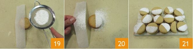 Para finalizar, decore os biscoitos: coloque uma tira de papel manteiga sobre metade da superfície e polvilhe a outra metade descoberta com açúcar de confeiteiro 19. Remova o papel delicadamente e, assim, você obterá um gracioso efeito bicolor 20. Os biscoitos de café estão prontos para serem saboreados 21!