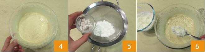 A mistura deve ficar bem integrada 4. Peneire a farinha, o amido de milho e o fermento através de uma peneira 5 e incorpore-os à mistura, uma colher de cada vez 6. Misture com a batedeira em baixa velocidade.