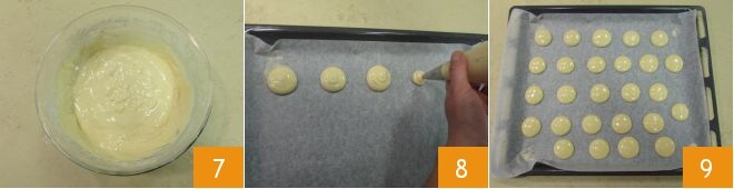 A mistura ficará bastante cremosa 7. Agora forre uma assadeira com papel manteiga, transfira a massa para um saco de confeitar com bico liso de 10 mm de diâmetro. Aperte discos de cerca de 3 cm de diâmetro 8, deixando espaço entre eles, pois durante o cozimento eles se alargarão ligeiramente. Com essas quantidades, você obterá cerca de 80 disquinhos 9.