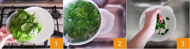 Para preparar os biscoitos de espinafre com creme de salmão, lave os espinafres em água corrente e depois seque-os. Escalde os espinafres por 1 minuto em água fervente, salgada 1. Escorra 2 e deixe esfriar.
