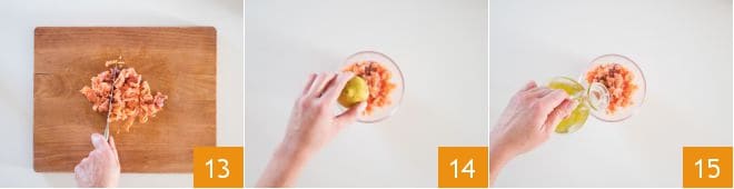 Enquanto isso, prepare o recheio. Corte o salmão defumado grosseiramente 13. Transfira-o para uma tigela e tempere com o suco de meio limão 14, um fio de azeite 15