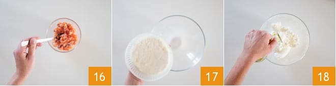 e misture tudo 16. Depois, coloque a ricota em uma tigela 17, adicione um fio de azeite 18