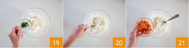 o endro picado 19, uma pitada de pimenta 20 e misture. Adicione o salmão defumado 21,