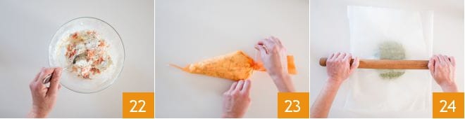 misture novamente 22 e transfira a mistura para um saco de confeitar 23, que você guardará na geladeira até o uso. Retire a massa e estenda-a entre 2 folhas de papel manteiga 24, até obter uma espessura de 3-4 mm.