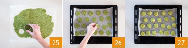 Em seguida, corte pequenos discos com um cortador de 5 cm de diâmetro 25 e transfira-os para uma assadeira forrada com papel manteiga 26 e asse em forno estático pré-aquecido a 180° por cerca de 15 minutos na parte central do forno. Conforme necessário, amasse novamente as sobras e corte mais biscoitos. Se a massa estiver muito mole, leve à geladeira. Uma vez assados, retire os biscoitos do forno 27 e deixe esfriar.
