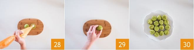 Assim que estiverem frios, pegue um biscoito, coloque um pouco de creme de salmão no centro 28 e feche com outro biscoito para criar um sanduíche 29. Continue assim até terminar seus biscoitos de espinafre com creme de salmão e sirva-os 30.