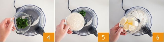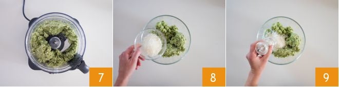 e triture tudo acionando o mixer por alguns segundos de cada vez 7. Transfira a mistura para uma tigela, adicione o Parmesão 8, o sal e a pimenta 9.