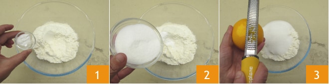 Para preparar os biscoitos de laranja, primeiro certifique-se de que todos os ingredientes estejam em temperatura ambiente. Em uma tigela, coloque a farinha, o fermento 1, o açúcar 2 e a casca de laranja ralada 3.