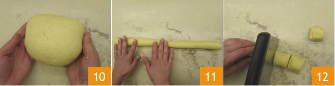 Em seguida, transfira a massa para uma superfície enfarinhada 10 e forme dois rolos 11. Corte pedaços de 30 g com uma espátula 12.