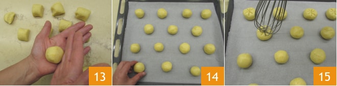 Forme bolinhas com as mãos 13 e coloque-as em uma assadeira forrada com papel manteiga 14, depois pressione a superfície com um batedor para deixar uma marca 15.