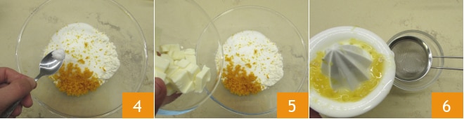 Adicione também uma pitada de sal 4 e a manteiga em cubos 5. Esprema a laranja e coe o suco com uma peneira 6.