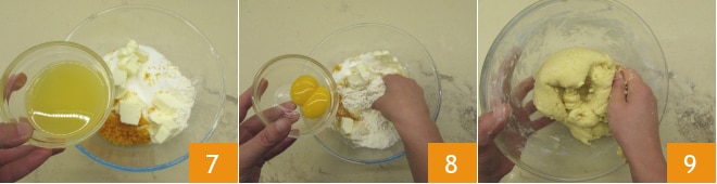 Adicione o suco à massa 7 e, por último, as gemas 8. Amasse manualmente para juntar todos os ingredientes 9.