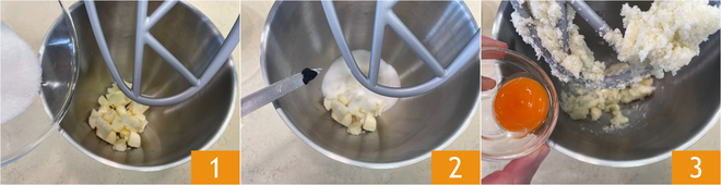 Para preparar os biscoitos de manteiga, como primeira coisa coloque a manteiga fria na tigela da batedeira planetária, equipada com o gancho em formato de folha. Adicione o açúcar 1, uma pitada de sal, as sementes da fava de baunilha 2 e ligue a máquina por alguns segundos. Quando a manteiga estiver amolecida, adicione a gema 3 e misture por cerca de um minuto.