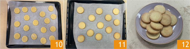Depois de formar os biscoitos, coloque-os em uma assadeira forrada com papel manteiga, distanciando-os levemente uns dos outros 10. Asse em forno estático a 170°C por cerca de 15 minutos 11, depois retire do forno e deixe esfriar. Seus biscoitos de manteiga estão prontos para serem saboreados 12!