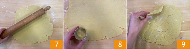 Passado o tempo de descanso, recupere a massa e, com a ajuda de um pouco de farinha, estenda-a para formar uma folha com espessura de cerca de 0,8 cm 7. Se estiver muito dura, você pode amaciá-la batendo delicadamente com o rolo de massa. Com um cortador de biscoitos de 4 cm de diâmetro, corte os biscoitos 8; você obterá cerca de 40 dessa medida. Você pode reutilizar os restos 9 amassando novamente e deixando a massa descansar na geladeira por mais 30 minutos.