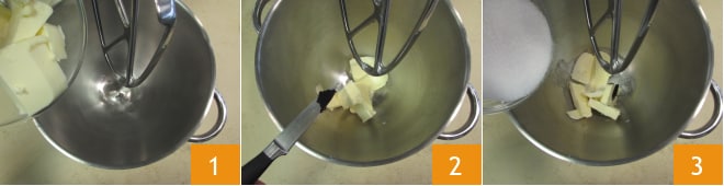 Para fazer os biscoitos de manteiga, coloque a manteiga fria na tigela da batedeira planetária equipada com o gancho em forma de folha 1, adicione as sementes de uma vagem de baunilha 2, o açúcar 3