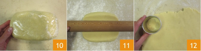 Envolva-o com filme plástico 10, coloque na geladeira e deixe descansar por pelo menos 30 minutos. Após o tempo de descanso, abra a massa sobre uma superfície com um rolo até uma espessura de cerca de 0,8 cm 11. Recorte os biscoitos com um cortador redondo de 4 cm 12. Com estas quantidades, você obterá cerca de 40 biscoitos, reutilizando as sobras de massa.