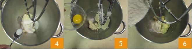 e o sal 4. Misture por alguns segundos, depois incorpore a gema ao composto 5 e bata novamente por cerca de 1 minuto. Acrescente também a farinha 6.