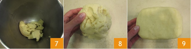 Misture até obter um composto homogêneo e compacto 7. Transfira a massa para uma superfície de trabalho levemente enfarinhada 8, trabalhe rapidamente com as mãos e forme um bloco 9.