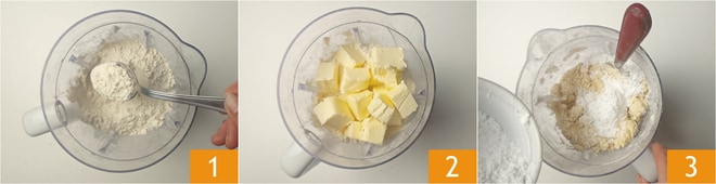 Para preparar os biscoitos de massa podre, primeiro coloque a farinha em um mixer 1 e adicione a manteiga fria cortada grosseiramente 2. Bata de forma intermitente para evitar que a manteiga aqueça demais, até obter uma consistência arenosa. Adicione também o açúcar de confeiteiro 3 e bata por pouquíssimo tempo.