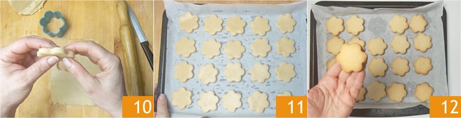 Forme os biscoitos cortando com as forminhas que escolheu: com essas quantidades obtivemos cerca de 60 florzinhas com diâmetro de 5-6 cm 10. Os restos podem ser reamassados para formar uma massa, mas você deve deixá-la descansar na geladeira por pelo menos 15 minutos antes de trabalhá-la. Coloque os biscoitos em uma assadeira forrada com papel manteiga 11 e asse em forno ventilado a 180°C por 12-14 minutos ou até que estejam dourados. Os biscoitos de massa podre estão prontos, deixe esfriar e decore a gosto 12!