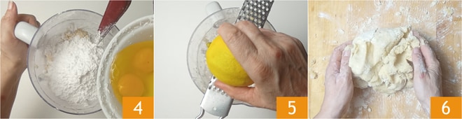 Adicione os ovos 4 e a casca de limão 5, depois bata rapidamente, apenas o tempo necessário para misturar os ingredientes. Transfira a massa para uma superfície de trabalho e trabalhe com as mãos o mais rápido possível, apenas o suficiente para obter uma massa lisa e homogênea 6.