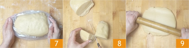 Envolva em um filme plástico ou em um saco de congelamento 7, coloque na geladeira e deixe descansar por pelo menos 30 minutos. Após esse tempo, retire a massa e divida em 4 partes, assim será mais fácil de manusear 8. Com um rolo, estenda folhas com cerca de 1 cm de espessura 9.