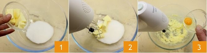 Para preparar os biscoitos de mel e sementes de papoula, coloque em uma tigela grande o açúcar refinado e a manteiga em temperatura ambiente cortada em pedaços 1. Misture com uma batedeira elétrica 2 e depois adicione o ovo inteiro em temperatura ambiente 3.