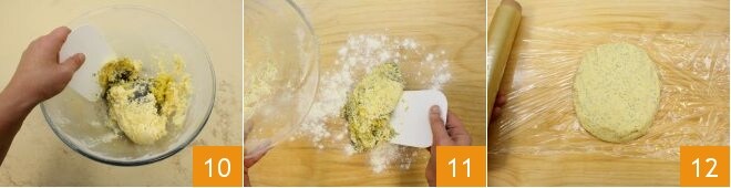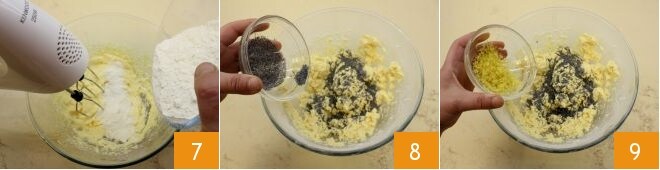 Adicione aos poucos os ingredientes secos peneirados à mistura de açúcar e manteiga 7 e misture para obter uma massa clara e espumosa; adicione as sementes de papoula 8 e a casca de limão ralada 9.