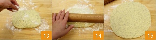 Após o tempo necessário, coloque a massa em uma superfície de trabalho enfarinhada; polvilhe um pouco de farinha 13 para evitar que grude, e com a ajuda de um rolo, estenda-a 14 até uma espessura de 5 mm 15.