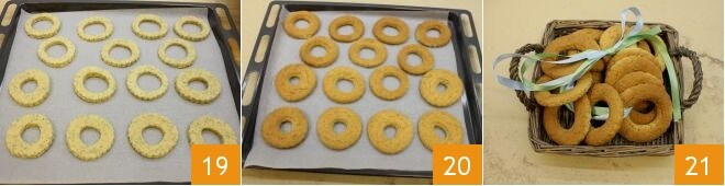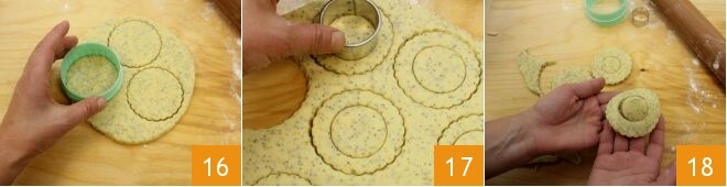 Use um cortador de biscoitos com 7 cm de diâmetro para cortar discos 16: com as nossas medidas, você deve obter cerca de 30 biscoitos. Com um cortador de biscoitos de 4,5 cm, corte o centro de cada disco para criar círculos menores 17. Com as mãos, remova delicadamente os discos internos 18 e amasse novamente para formar um bloco; cubra novamente com filme plástico e deixe descansar na geladeira por pelo menos 15 minutos, depois repita a operação até terminar a massa.